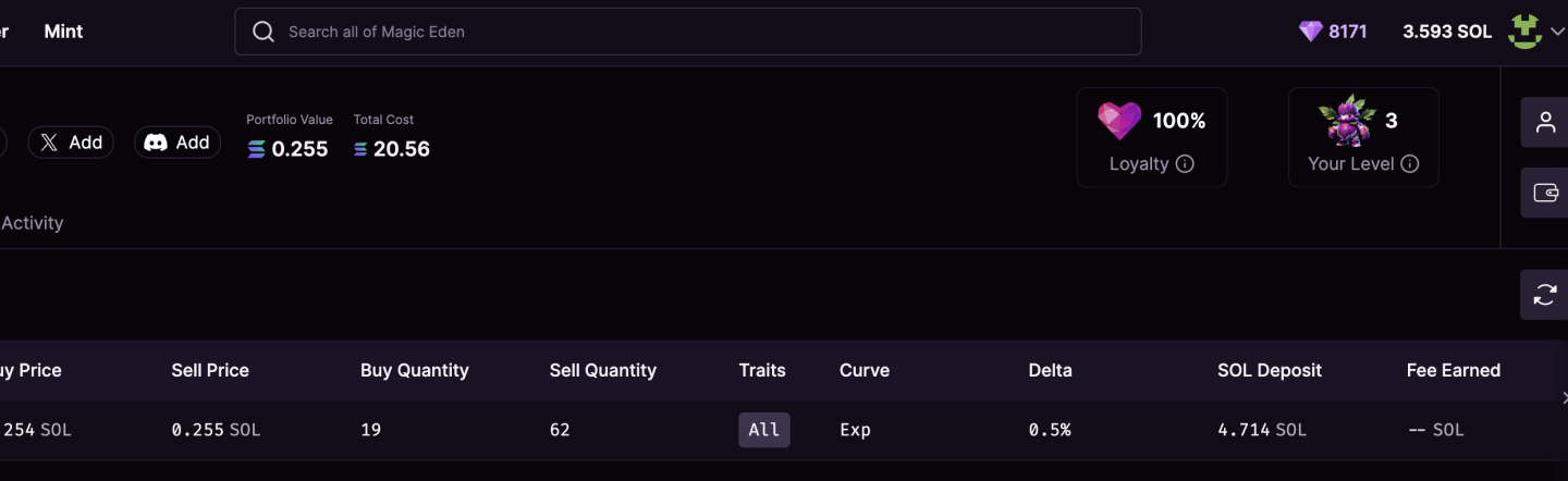 - Loyalty Maximization: Aim for 100% loyalty to receive double the Diamonds. Adjust your listings on Magic Eden by delisting and relisting NFTs and track your progress using the Loyalty-o-Meter.