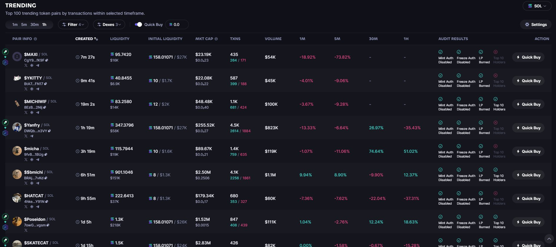 This shows the top 100 trending token pairs by transactions in the selected timeframe. Avoid using timeframes under 30 minutes for memecoins to get more stable and accurate data.